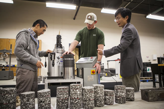 The team will then design rubberized asphalt mixtures and subject the material to an accelerated weathering test. “I am particularly interested in seeing how the mixtures can survive weather aging,” said Shen. In addition, other performance properties such as the rutting and anti-stripping properties of the designed mixtures will be evaluated. Lastly, a comprehensive comparison of the mixtures designed with crumb rubber will be conducted considering both the laboratory and the field performance obtained through the team’s study. Based on the results, Georgia Southern researchers will then provide the GDOT with recommendations for building durable, economical and green rubberized pavements. “The potential cost savings and ultimately the environmental impact could be tremendous for the state of Georgia,” said Shen. “Georgia Southern has made a significant investment to establish a new Asphalt Laboratory, and we are excited about the services that we are now able to provide to the paving industry and government agencies.”
