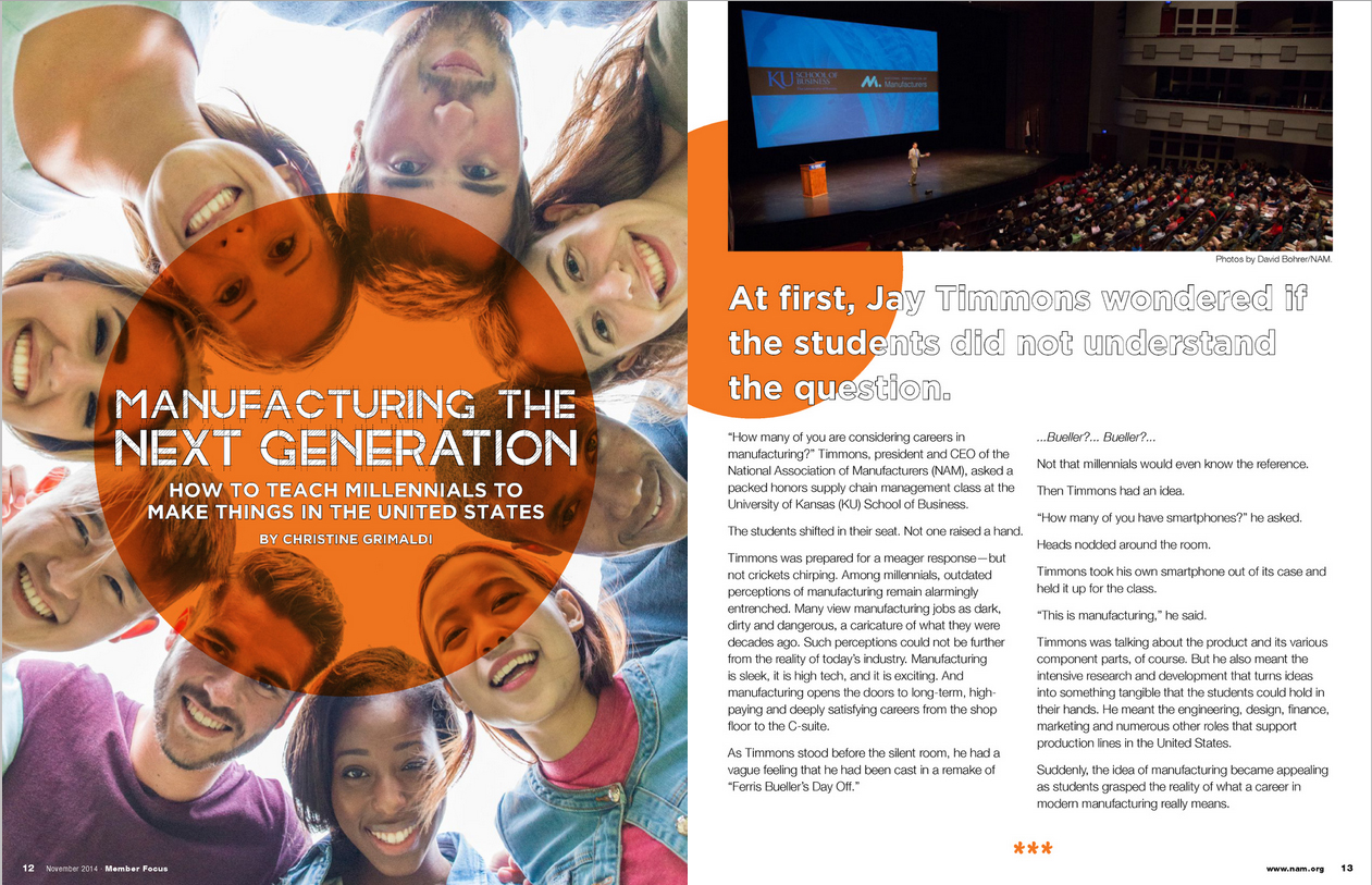 Georgia Southern University is featured in the latest edition of the National Association of Manufacturers’ digital newsletter. President Brooks Keel was interviewed in the November 2014 edition of Member Focus: The Workforce Issue, Manufacturing the Next Generation. You can view the article, which discusses how to teach Millennials to manufacture products in the United States, on pages 12-15.