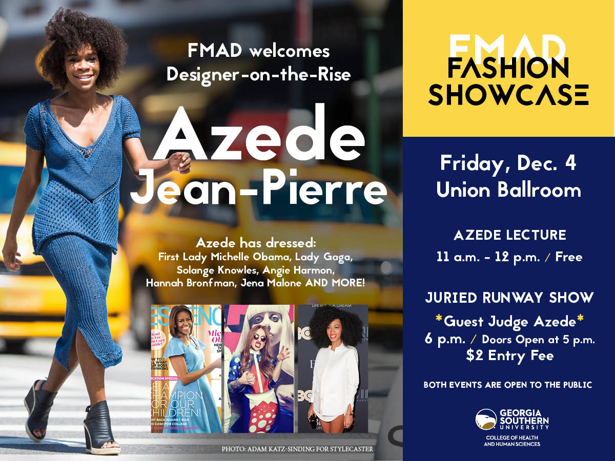 Georgia Southern University’s Fashion Merchandising and Apparel Design (FMAD) program and Fashion Menagerie, Georgia Southern’s premier fashion student organization, will host fashion designer Azede Jean-Pierre for a lecture and guest judge at the student Showcase, set for Friday, Dec. 4, in the Russell Union Ballroom.