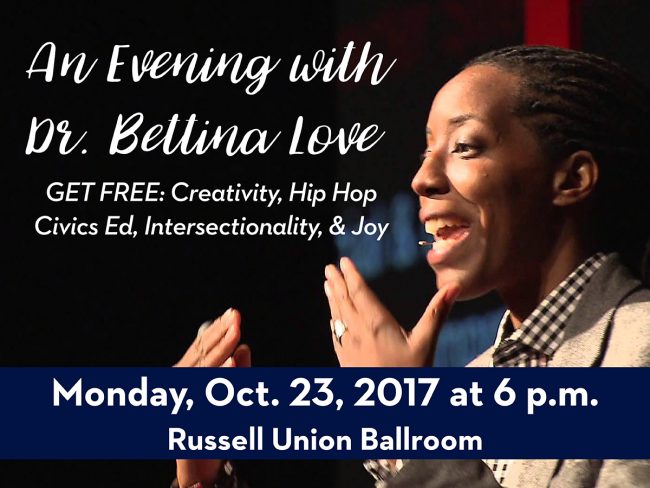 Award-winning author and esteemed hip-hop educational researcher Bettina L. Love, Ph.D., will speak on campus Monday, Oct. 23, at 6 p.m. in the Russell Union Ballroom.