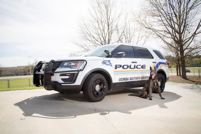 Deimos, the first canine on Georgia Southern’s Police force, primarily works with Officer Erk McCurdy, who has worked as a K-9 handler for more than 15 years. Deimos is trained to detect more than 15 kinds of dangerous or illegal scents, and he is on-call for every major University event, guest speaker and athletic game.