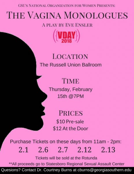 The Georgia Southern University chapter of the National Organization for Women (NOW) will host a reading of “The Vagina Monologues,” on Thursday, Feb. 15 at 7 p.m. in the Russell Union Ballroom on the Statesboro Campus, to raise awareness and funds for the nonprofit organization, V-Day and the local nonprofit, the Statesboro Regional Sexual Assault Center (SRSAC).