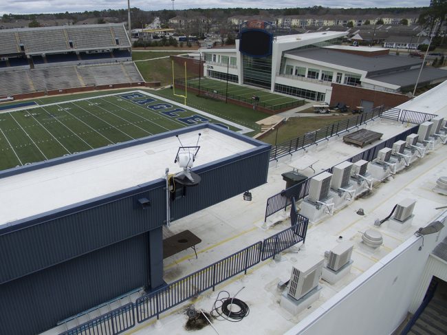 Solar tracking equipment is mounted at Allen E. Paulson Stadium. Researchers at Georgia Southern use this to gather data on solar energy for the area.