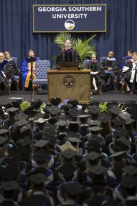 On May 4 and 5, more than 4,000 undergraduate and graduate students from Georgia Southern University’s Statesboro, Armstrong and Liberty Campuses received degrees in three Spring Commencement ceremonies. Georgia Southern President Jaimie Hebert, Ph.D., welcomed the graduates and their families to Spring Commencement and recognized the University faculty members who helped students along their academic journey. “I extend to you my personal congratulations on your academic success,” said Hebert. “I would like to pay special tribute to our faculty, who are collectively the heart of this University and who are individually mentors of these graduates. Each graduate will have his or her own special story about a professor whose inspiration and interest influenced that student’s success not only in college, but also in ways that will be appreciated even more as the future unfolds. Caring faculty, committed to the success of students, is the hallmark of Georgia Southern University.”