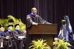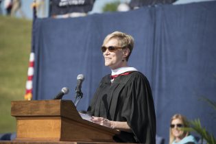 Persons encouraged the graduates to practice their virtues, be honest and candid in their dealings with others and to always treat others the way they want to be treated. “Do whatever you can to help those who are coming behind you,” he said. “Make your teachers proud.” In closing, he implored, “Remember this: you have something no one can ever take away from you — your education.” On May 5, cheers for approximately 2,700 undergraduates erupted throughout the Allen E. Paulson Stadium commencement ceremony on the Statesboro Campus. Hala Moddelmog, a Georgia Southern alumna who is the first female president and CEO of the Metro Atlanta Chamber, delivered the opening address and encouraged graduates to hold firm to who they are.