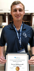 Georgia Southern University health and physical education major Carson Hollingsworth recently received the Major of the Year Award at the 2018 Society of Health and Physical Educators’ national convention and expo in Nashville, Tennessee. “Carson has become a leader in the field of health and physical education in a short time as an undergraduate student,” said Gavin Colquitt, Ed.D., associate professor of health and physical education at Georgia Southern. Hollingsworth, who graduated this month, was selected as the student representative for the Georgia Association for Health, Physical Education, Recreation and Dance in his junior year and served a one-year term. He also participated in multiple advocacy efforts for physical education, including a trip to Washington, D.C., where he met with members of Congress at Speak Out! Day in support of school health and physical education. He plans to pursue a master’s in health and physical education as well as a graduate certificate in coaching. His goal is to work in a school system so that he can positively impact children’s lives. “This award meant a lot to me and reinforced that hard word does pay off,” said Hollingsworth. The Major of the Year Award celebrates outstanding undergraduate students in the fields of health, physical education, recreation and dance. Students are nominated by their faculty and must have a 3.0 grade point average or higher. Nominees must also be within their junior or senior year of the required majors and provide service to their school or community for a minimum of two years. For more information about Georgia Southern’s bachelor’s in health and physical education program, visit http://coe.georgiasouthern.edu/hpe/. Georgia Southern University, a public Carnegie Doctoral/Research institution founded in 1906, offers 141 degree programs serving more than 27,000 students through nine colleges on three campuses in Statesboro, Savannah, Hinesville and online instruction. A leader in higher education in southeast Georgia, the University provides a diverse student population with expert faculty, world-class scholarship and hands-on learning opportunities. Georgia Southern creates lifelong learners who serve as responsible scholars, leaders and stewards in their communities. Visit GeorgiaSouthern.edu.