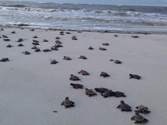 Dozens of loggerhead sea turtle hatchlings make their way down the beach of St. Catherines Island into the Atlantic Ocean.