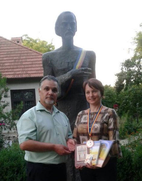 Olga Amarie stands in front of a monument of Alexie Mateevici with Ioan Găină, whose works she translated.