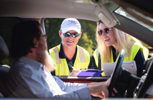 Brian Buck, a doctor of public health student, and Jessica Schwind, Ph.D., epidemiology professor in the Jiann-Ping Hsu College of Public Health, welcome a drive-thru flu clinic participant.