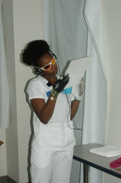 A Georgia Southern nursing student participates in the Virtual Dementia Tour.