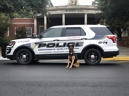 Georgia Southern University Police Department’s K9 “Bear” has received a bullet and stab protective vest thanks to a charitable donation from non-profit organization Vested Interest in K9s, Inc. The vest was sponsored by Optima Energy, Inc. and embroidered with the sentiment “This gift of protection provided by Optima Energy. Vested Interest in K9s, Inc. is a 501c(3) charity located in East Taunton, MA whose mission is to provide bullet and stab protective vests and other assistance to dogs of law enforcement and related agencies throughout the United States. The non-profit was established in 2009 to assist law enforcement agencies with this potentially lifesaving body armor for their four-legged K9 officers. Since its inception, Vested Interest in K9s, Inc. provided over 3,100 protective vests in 50 states, through private and corporate donations, at a value of $5.7 million dollars. The program is open to dogs actively employed in the U.S. with law enforcement or related agencies who are certified and at least 20 months of age. New K9 graduates, as well as K9s with expired vests, are eligible to participate. The donation to provide one protective vest for a law enforcement K9 is $950. Each vest has a value between $1,744 – $2,283, and a five-year warranty and an average weight of 4-5 lbs. There are an estimated 30,000 law enforcement K9s throughout the United States. For more information or to learn about volunteer opportunities, please call 508-824-6978. Vested Interest in K9s, Inc. provides information, lists events, and accepts tax-deductible donations of any denomination at www.vik9s.org or mailed to P.O. Box 9 East Taunton, MA 02718. Georgia Southern University, a public Carnegie Doctoral/R2 institution founded in 1906, offers 141 degree programs serving nearly 26,500 students through nine colleges on three campuses in Statesboro, Savannah, Hinesville and online instruction. A leader in higher education in southeast Georgia, the University provides a diverse student population with expert faculty, world-class scholarship and hands-on learning opportunities. Georgia Southern creates lifelong learners who serve as responsible scholars, leaders and stewards in their communities. Visit GeorgiaSouthern.edu.