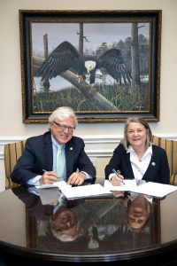 East Georgia State College President Robert G. Boehmer and Georgia Southern University President Shelley C. Nickel sign memorandum of understanding.