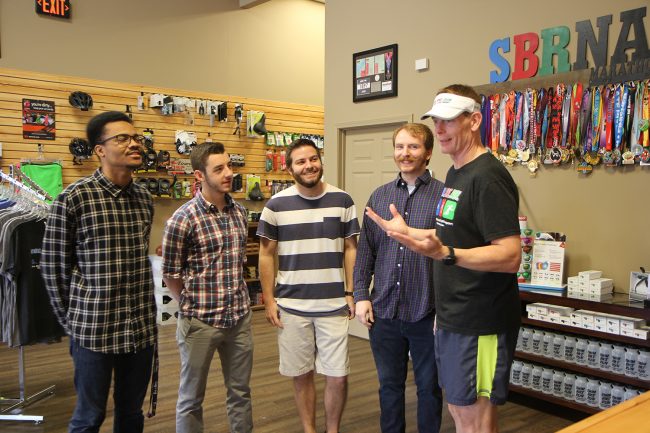 From left, tudents Marcus Joachim, Jacob Poston, Shadrach Stark and Thomas Martin talk about Ghost Runner with Don Borowski, owner of Swim. Bike. Run.