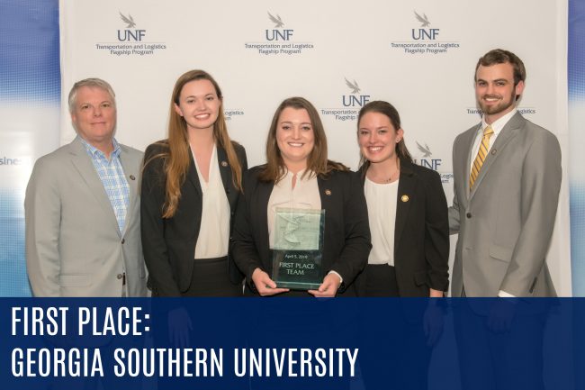 Four senior logistics and supply chain management students in the Parker College of Business brought home a second consecutive win from the Intermodal Association of North America (IANA) Logistics and Supply Chain Management Case Competition in Jacksonville, Florida. Alecia Breen, Madeleine Haney, Shelby Bates and Tate Robinson won first place after competing against six other student teams from Auburn University, University of Arkansas, University of Maryland, University of North Florida, University of North Texas and the University of South Florida during the 11th annual event in April. This year’s focal case required students to leverage topical knowledge about types of intermodal equipment, regulatory limitations, due date promises and analytical computations to find the most cost-efficient shipping plan for a sub-network of parcel package carrier’s operations. “Our team worked hard and delivered a top-notch presentation,” said Jerry Burke, Ph.D., the team’s advisor and a professor and chair of the Department of Logistics and Supply Chain Management. “The industry judges made a point to let me know our team did an excellent job. Many thanks to IANA for supporting these competitions and also for supporting the Department of Logistics and Supply Chain Management as an IANA Scholar School.” Larry Gross of Gross Transportation Consulting was commissioned to develop the intermodal case study specifically for the competition. The student presentations were judged by a group of business professionals representing a broad section of intermodal supply chains. In addition to competing, the students enjoyed a Behind the Tracks tour hosted by CSX at the corporate headquarters in downtown Jacksonville, where students had the opportunity to network with industry professionals and their peers, learn about the academic programs at other universities, and hone their analysis and presentation skills.