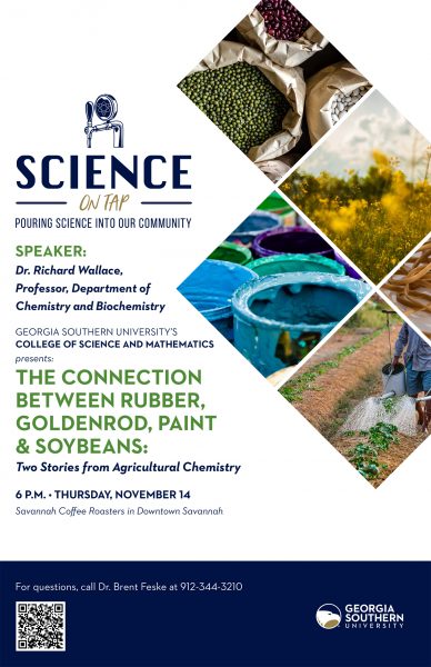 Chemistry will be the topic of the next Science on Tap lecture, which will be held at Savannah Coffee Roasters in Savannah on Nov. 14 at 6 p.m. Richard Wallace, Ph.D., a chemistry professor on the Georgia Southern University Armstrong Campus, will present, “The Connection Between Rubber, Goldenrod, Paint, & Soybeans: Two Stories from Agricultural Chemistry.”
