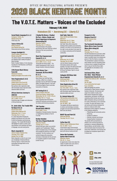 For more information on the 2020 Black Heritage Month Celebration, visit https://calendar.georgiasouthern.edu/search/events?search=black+heritage+month.