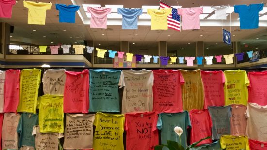 The Clothesline Project is a T-shirt display that honors and empowers victims of violence. T-shirts with inscribed messages from victims of violence, representing Georgia Southern students impacted by violence against them, family, peers or friends, are hung around campus. Survivors of violence are encouraged to personalize T-shirts with their own messages and add them to the display.