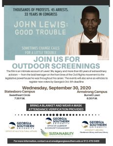 In celebration of the life of former U.S. Rep. John Lewis, Georgia Southern University’s Office of Multicultural Affairs, Office of Leadership and Community Engagement, Sustainability Programs and University Libraries will host two free outdoor screenings of “Good Trouble,” on Sept. 30 on the Statesboro and Savannah campuses. The events will also serve as vehicles to register new voters by the Oct. 5 deadline in Georgia.