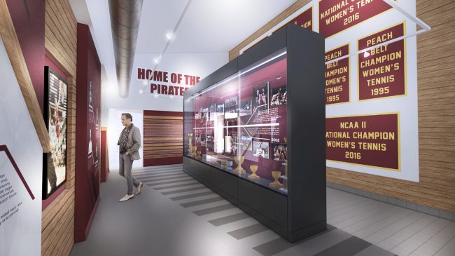A list of all 316 All-Americans will be displayed on the north wall, framing two interactive digital display screens that will tell the history of Pirate athletics.