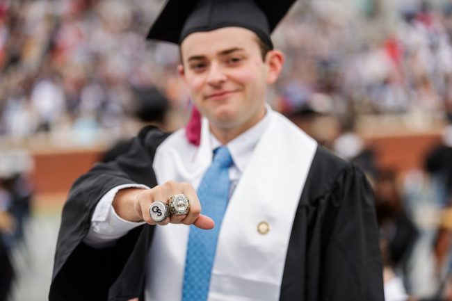 “We won the game for the Camellia Bowl the season I started working with athletics and that helped me know that this was what I wanted to do,” Schwartz said. “The New Orleans Bowl was really special for me though, not just because it was a crazy year with COVID, but because it was my first year as the lead student for GATALifestyle and so I got to be so much more involved that year. The players wear their rings at graduation and so do some of the student assistants, so I decided to wear mine too.”