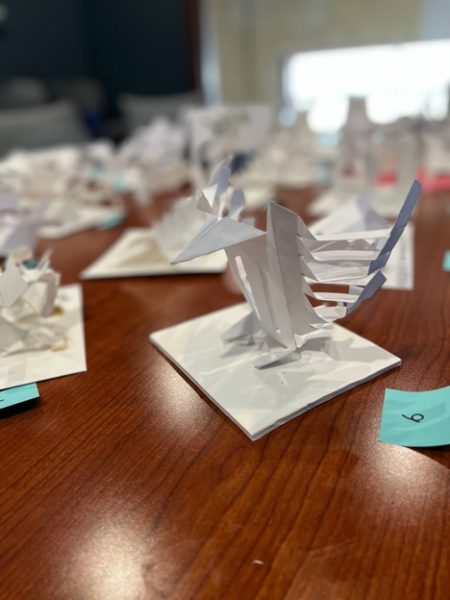 Alongside her fellow students in Assistant Professor Casey Schachner’s 3D Art and Design Foundations classes, she was to use a 6-by-6-inch square piece of paper to create a three-dimensional object. Students could cut and fold the paper, but they could not remove or reattach pieces of paper. The paper submissions were juried by art and community representatives, and eight were selected to be translated into full-steel sculptures.