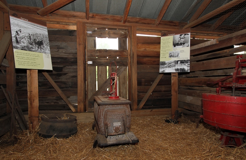 The restored Weathervane Barn, formerly Mr. Bland’s Mule Barn, is now home to an exhibit of farm life during the 1930s, when the Bland Farm was active.  Each stall provides a chance to discover a special part of coastal plain life, including cotton, tobacco, and row crop farming, turpentining, and the day-to-day operations of the farm.  Put a hand to the well-worn handle of a plow, spin one of Mr. Bland’s whirligigs, and marvel at the ingenious tools and industrious spirit it took to build a life on the coastal plain.