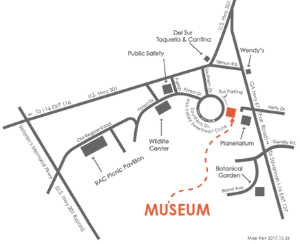 The Herty Drive entrance to Georgia Southern from GA HWY 67 will no longer take you to the Museum. Instead, you must enter from U.S. HWY 301 on either Southern Drive or Parrish Drive. Take a right onto Sweetheart Circle (one way) and proceed to the Museum.