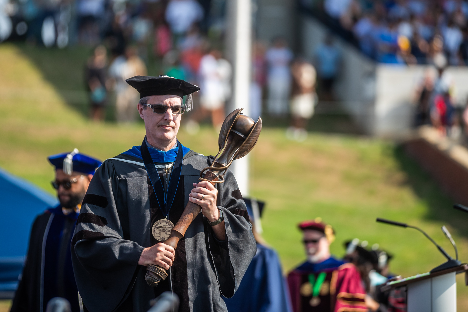 Leading the Processional of faculty and administration is the Macebearer, the faculty member holding the rank of Professor with the highest seniority of service at Georgia Southern University. The mace is a two-and-one-half foot shaft and sphere of cast Everdur bronze and carved American walnut. This representation of the ceremonial symbol of office and authority was designed and crafted in 1988 by Thomas P. Steadman, associate professor of art. Its angular forms and low-gloss finishes are reminiscent of the medieval battle mace from which the more scepter-like academic mace evolved. The design of the mace blends forms suggested by native flora of south Georgia. The magnolia leaves and stems encircling the head of the mace in a double helix symbolize Georgia Southern’s link with its region. A small ballast rock, found on the Georgia coast and traced to probable British origin, is embedded in the finial base of the shaft representing the foundation of the institution.