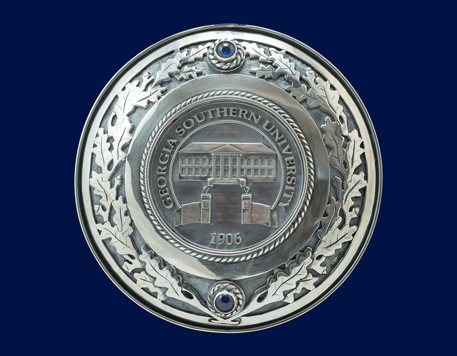 The presidential medallion and chain, worn by the president of Georgia Southern University as part of the president’s academic regalia, symbolizes the University and signifies the authority and responsibility of its highest executive office. Georgia Southern’s presidential medallion and chain is a custom-designed, handcrafted work of art. Professor Christina Lemon and Georgia Southern alumna Madeline Shelor collaborated on the custom design and creation of the medallion and chain using a combination of traditional methods and new technology. The medallion is a three-and-one quarter inch circular pendant form made from sterling silver and accented with two blue Sapphire cabochon stones (smooth rounded stones). The dimensional medallion design features a cast sterling silver relief of the Georgia Southern University seal design. The center of the seal design includes a relief image of the iconic Marvin Pittman Administration building on historic Sweetheart Circle. Encircling the central seal design are stylized oak leaf and acorn motifs, the enduring emblem of strength, stability, honor and longevity. Each oak leaf is crafted in relief and hand engraved. A smaller oak leaf motif continues on the reverse side.