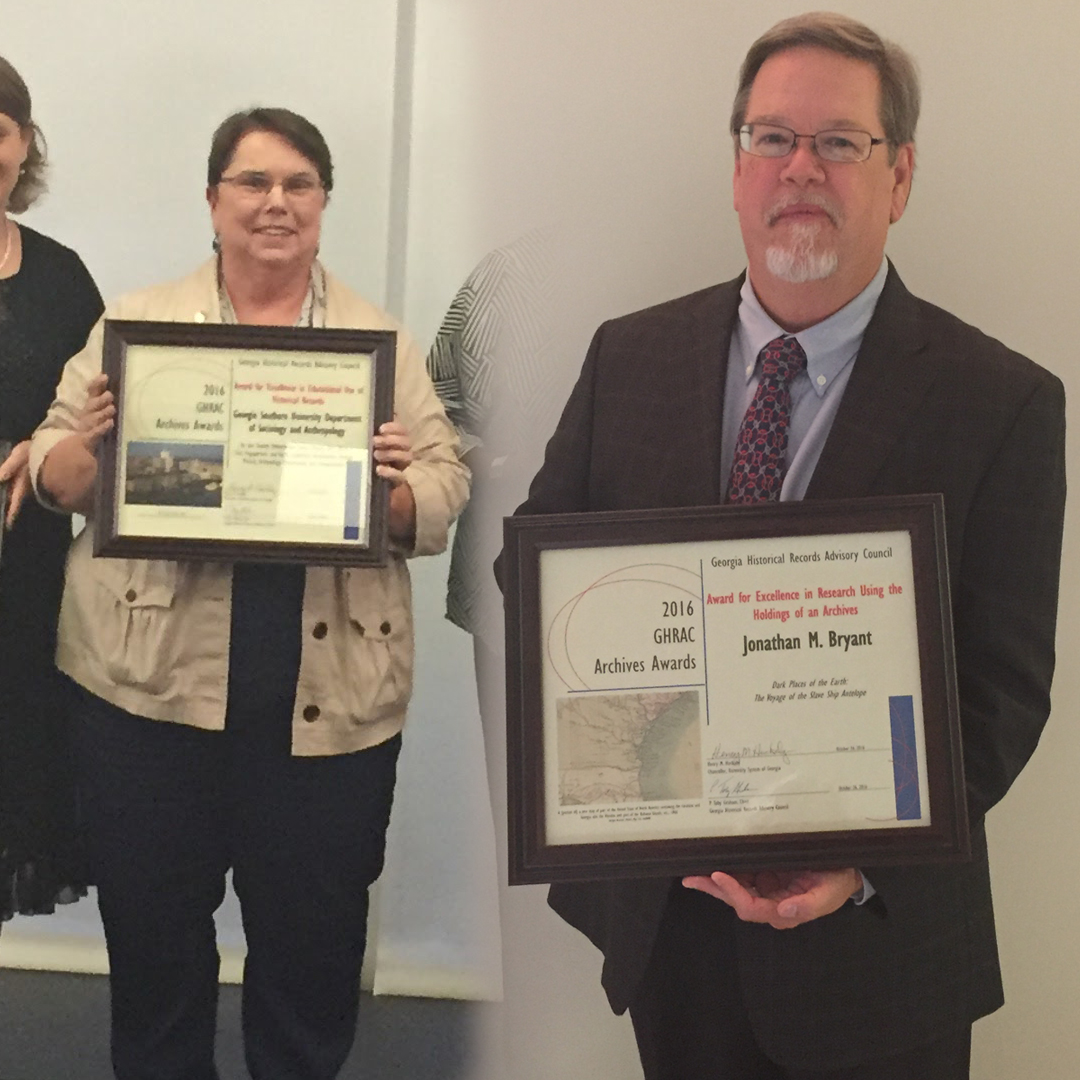 Georgia Southern’s College of Liberal Arts and Social Science’s (CLASS) faculty members, Jonathan M. Bryant, Ph.D., and Sue Moore, Ph.D., were honored at the Georgia Historical Records Advisory Council’s (GHRAC) 14th Annual Archives Awards on Oct. 26 at the Georgia Archives.