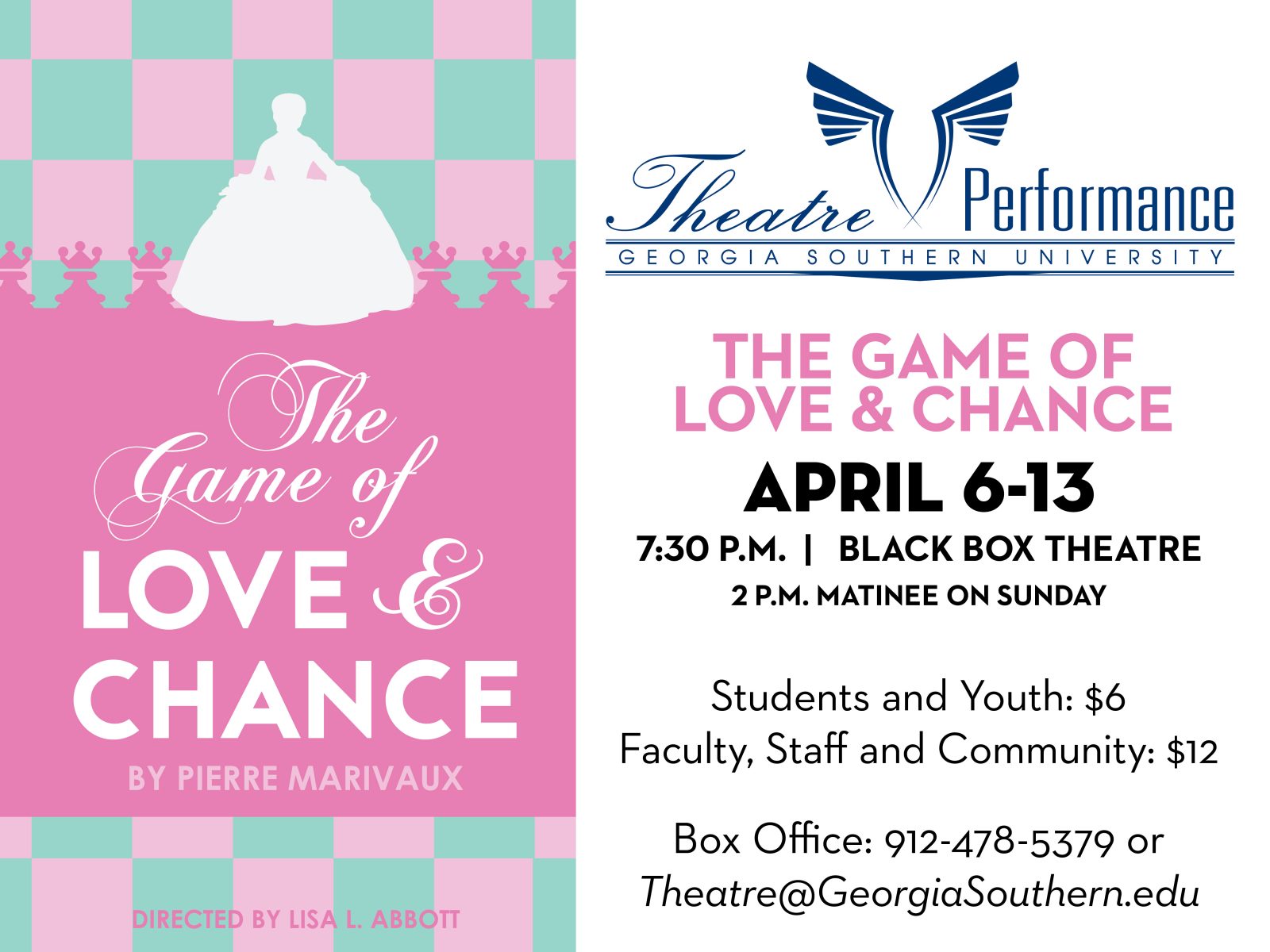 The Theatre & Performance program at Georgia Southern University will close the main stage season with Pierre Marivaux’s farce “A Game of Love and Chance” at the Center for Art & Theatre’s Black Box theatre April 6-13.