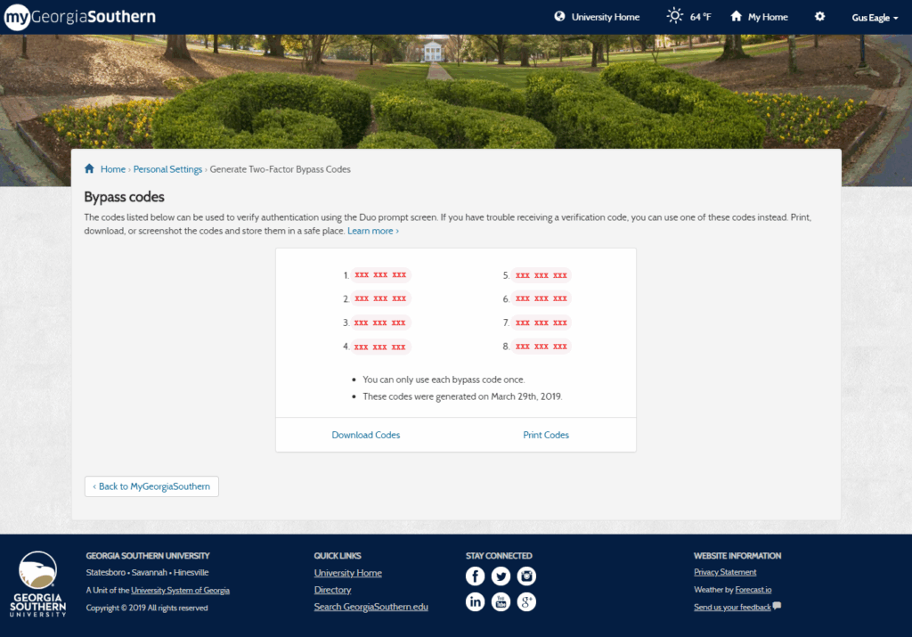 As a backup authentication method, you can use a set of bypass codes generated in the Personal Settings tile of your MyGS portal. To generate codes, simply log in to the MyGS portal, expand the Personal Settings Tile, and click the “Generate Two-Factor Bypass Codes” link. You can then print, download, or take a screenshot of the codes. These codes can be entered using the “Enter a Passcode” button in the Duo prompt screen. Be sure to store the codes in a safe place.