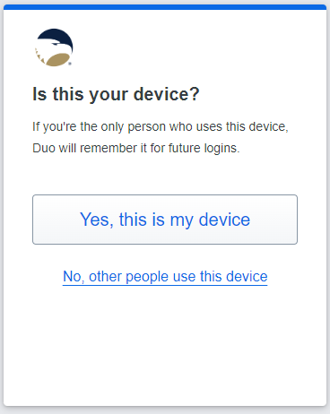 And the best news? Enabling the “Remember Me” feature is easy: Just click the “Yes, this is my device” on the Duo prompt screen when you verify your login: