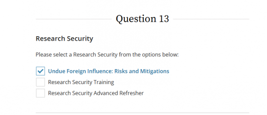 • Once you have a CITI account, you must add the Undue Foreign Influence course.  Once logged in, look for the “Add a Course” link near your course list,  scroll to Question 13, select “Undue Foreign Influence: Risk and Mitigation” and click Submit at the bottom of the page.