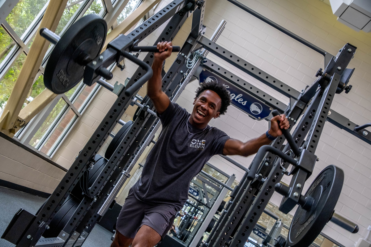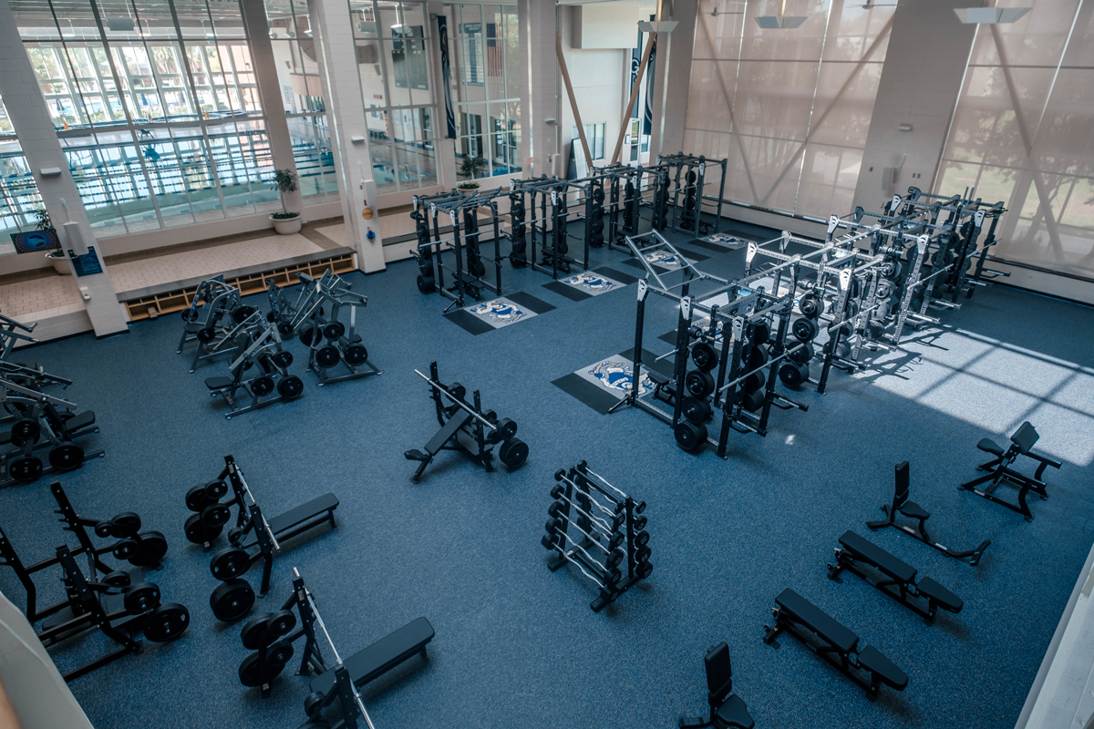 The Weight Room features a wide range of resistance and strength training equipment, including squat racks, bench presses, free weights, selectorized machines, and more.